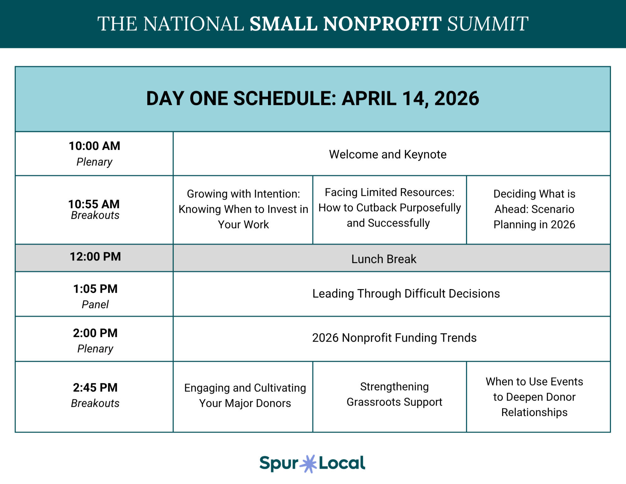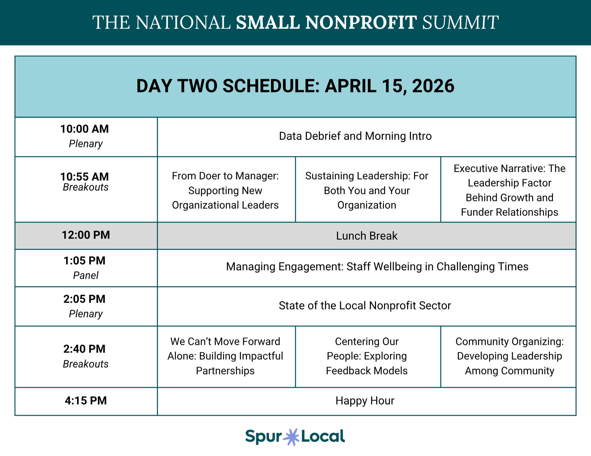 The nonprofit sector continues to be asked to respond faster and do more with less. How do we build the plan, people power, financial resources, and community to meet this current moment and move beyond it? Spur Local's annual National Small Nonprofit Summit creates space for nonprofit professionals to explore this question together.Over two days, connect with other professionals and dive deeper into organizational planning, management, fundraising, and community building. Across interactive panels, small-group breakouts, and plenary presentations, we’ll focus on actionable takeaways that are accessible and effective for organizations with small teams or limited budgets.As a result of these practical sessions and honest conversations, you will leave with deeper relationships and ways to turn urgency into clarity and ideas into action. Register to join us today.